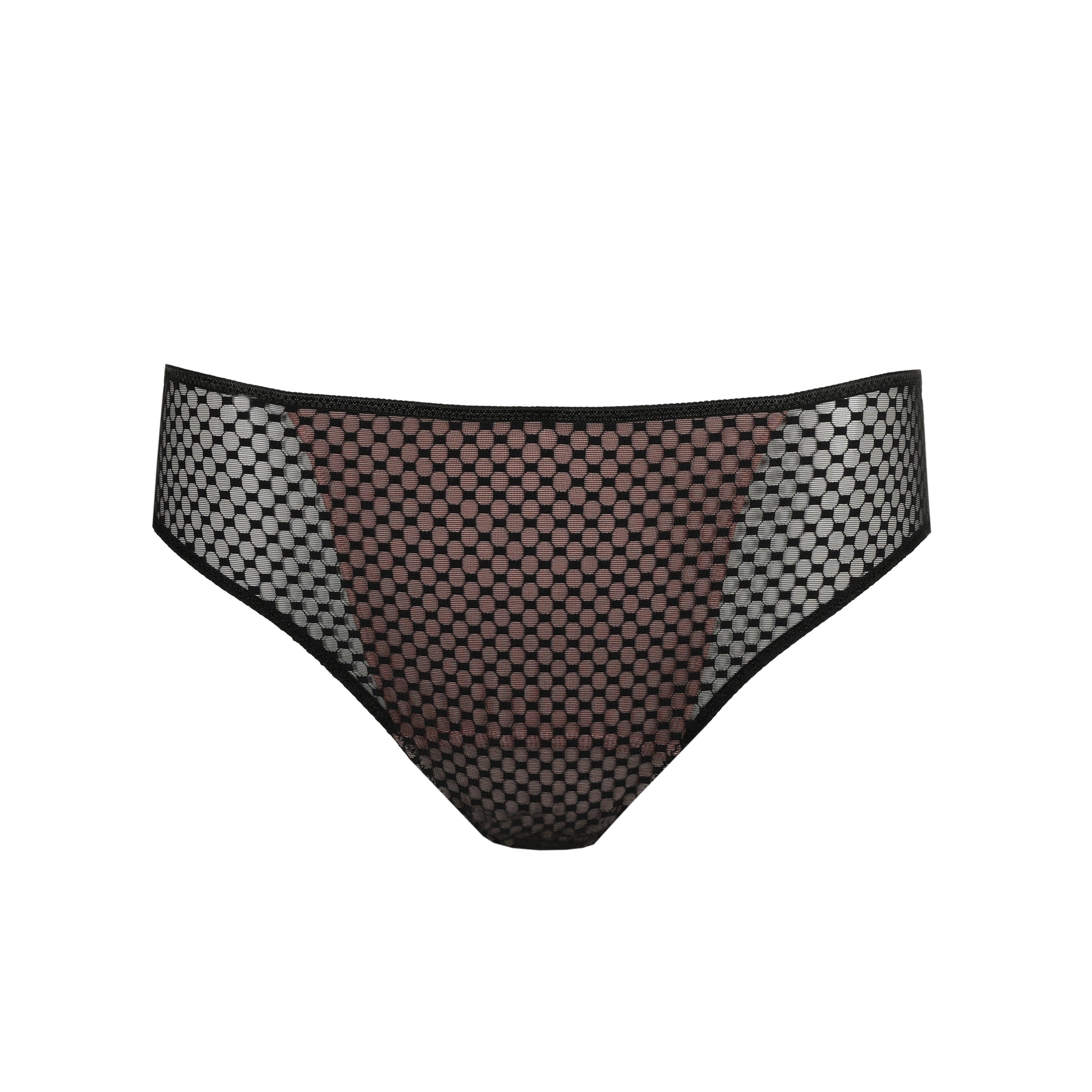 Braga clásica en sexy tul de lunares, con suave microfibra en la espalda. Un elegante recorte detrás completa el look. El tiro alto de la braga rio alarga y estiliza visualmente las piernas. Gracias al delicado acabado en las perneras, la braga no se marcará por debajo de la ropa.