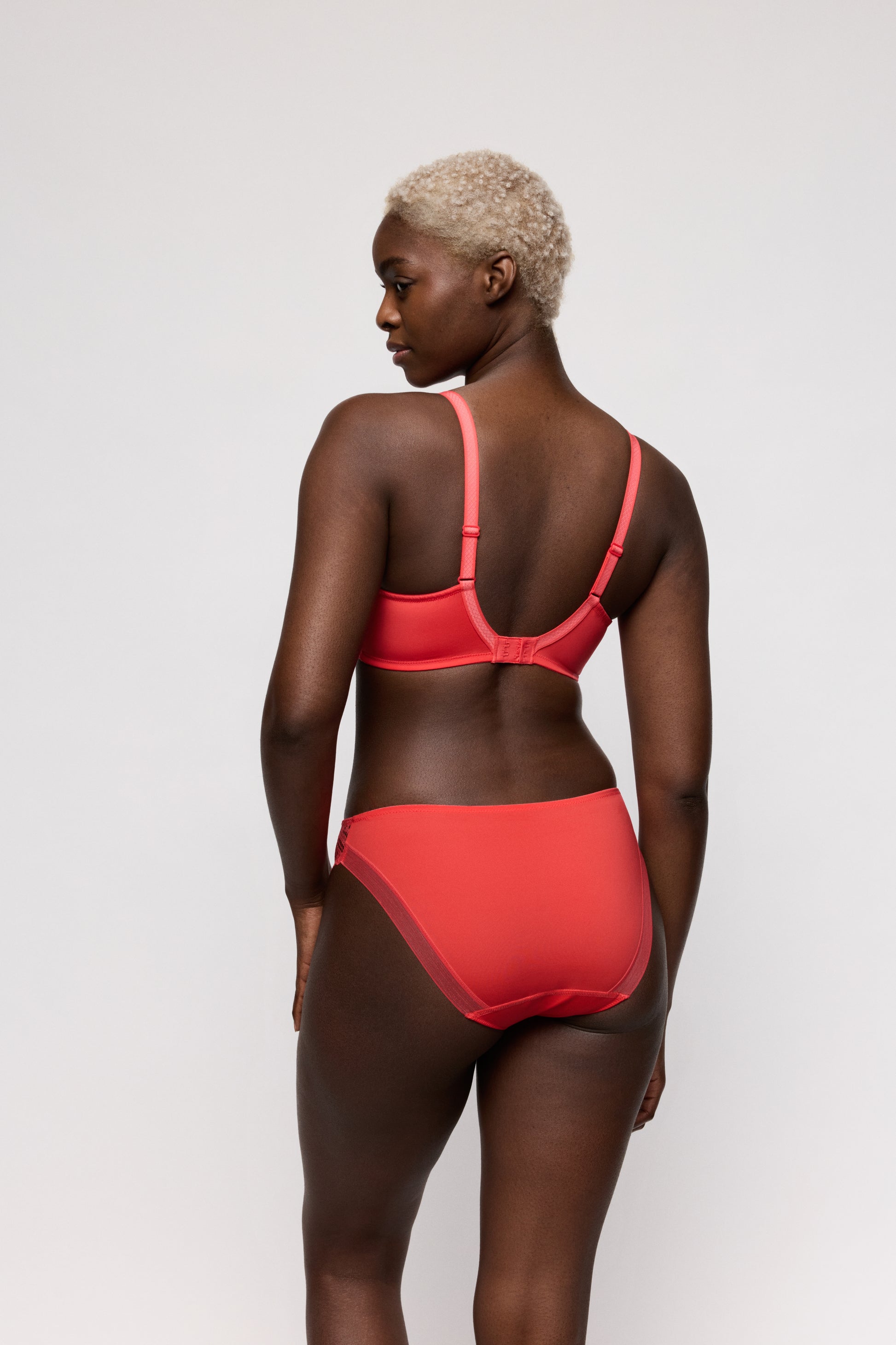 Minimalismo con encaje y un ajuste fabuloso. En un cálido tono rojo coral