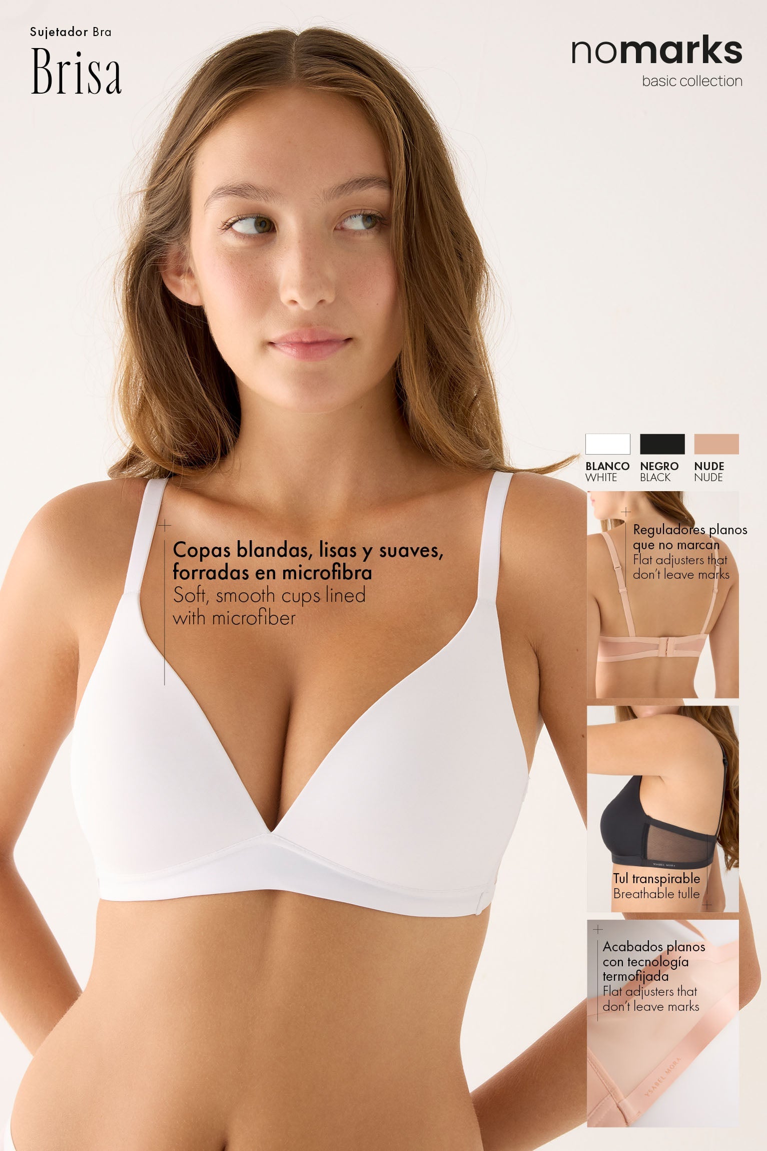 Dentro de la línea nomarks, el modelo Brisa representa una vida sin presiones y un diálogo de bienestar con tu cuerpo. Es un sujetador sin aros que maximiza la comodidad sin perder la forma.