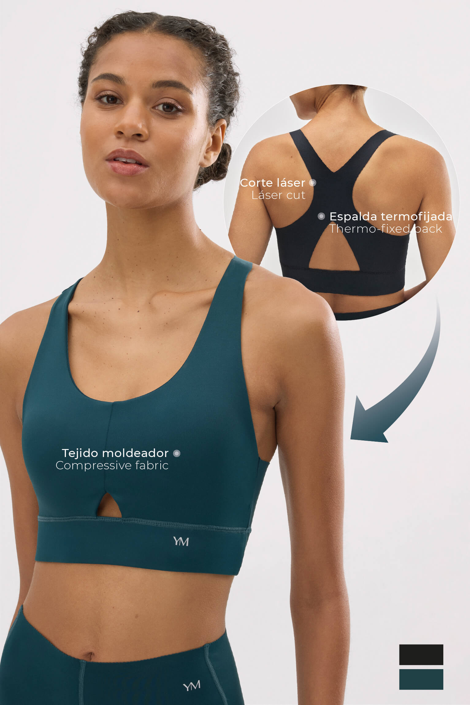 Sujetador deportivo técnico que ofrece un nivel de sujeción media, ideal para actividades de impacto moderado. Incluye acabados láser y una espalda termofijada para minimizar las rozaduras. Gracias a su tecnología compresiva que moldea la silueta, proporciona una seguridad y control superiores en cada movimiento.